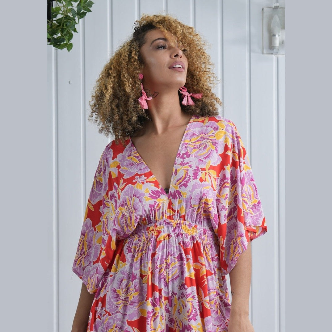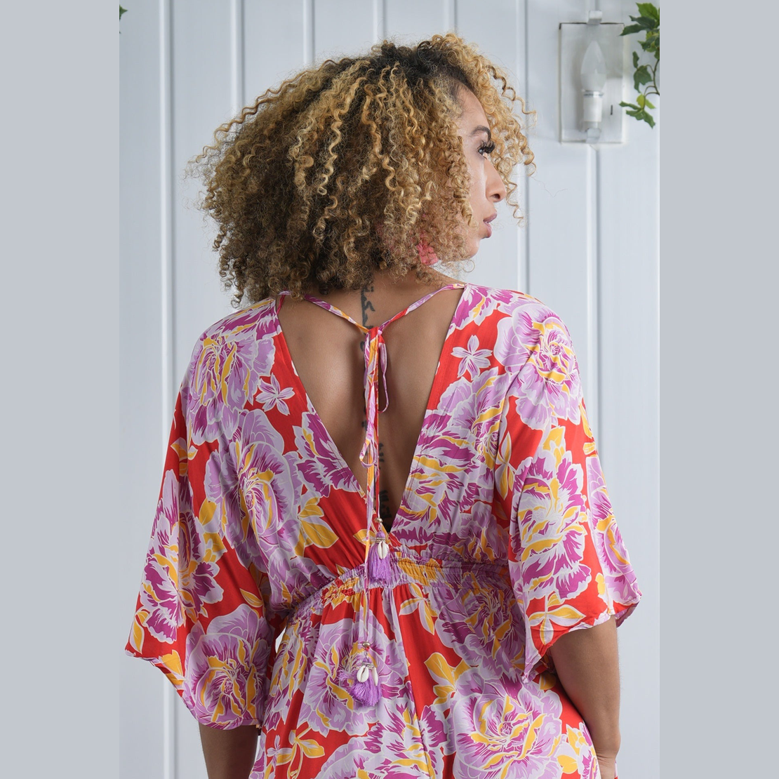 🌺Estampado floral alegre: mezcla de rojos, lilas y toques de amarillo que despiertan emociones y te conectan con lo natural. 👗Corte ancho y fluido: cómodo como un pijama, pero con el look de un estilismo pensado. 🧵Tejido ligero y suave: ideal para primavera, verano o para llevar en casa y sentirte divina igual. 💃Mangas amplias + escote cruzado: equilibrio entre sofisticación y libertad. 👜Versátil: queda perfecto con sandalias, tacones o deportivas blancas.