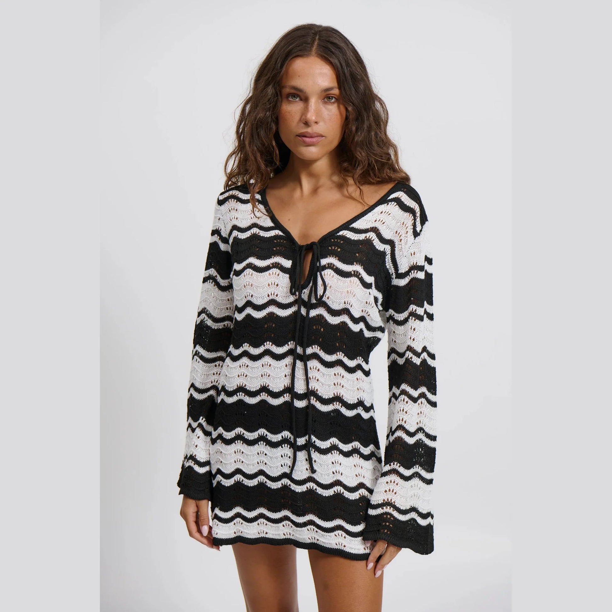 Esta túnica de punto calado combina el blanco y negro en un estampado de ondas que nunca pasa de moda. Su diseño suelto, con escote ajustable y mangas largas, te aporta libertad y un aire sofisticado tanto en la playa como en un paseo relajado por la ciudad.