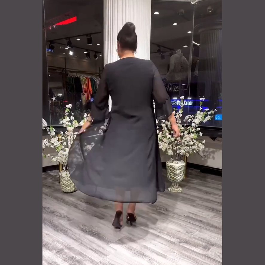 Este vestido fluido con mangas semitransparentes y aplicaciones delicadas está diseñado para realzar tu estilo sin esfuerzo. Su caída suave y su diseño envolvente aportan movimiento y ligereza, mientras que los detalles florales con pedrería añaden un aire distinguido.